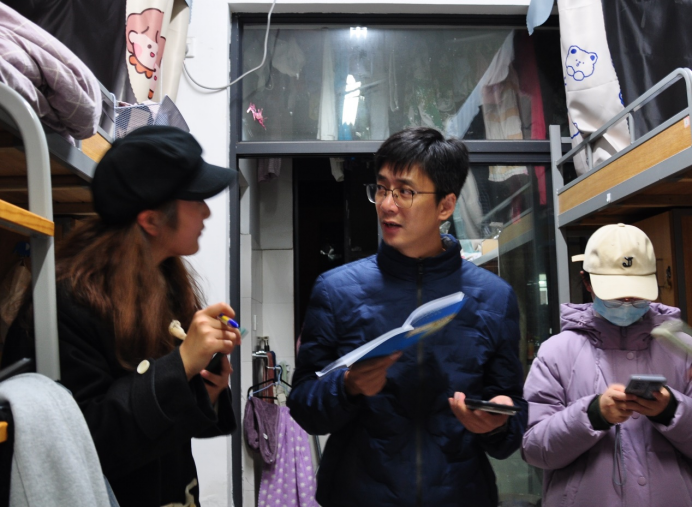 水始冰,地始冻,冬始至。11月9日晚,学工部部长屠立达在辅导员顾蒙的陪同下走访新生寝室,关心大家近期的学习生活情况。