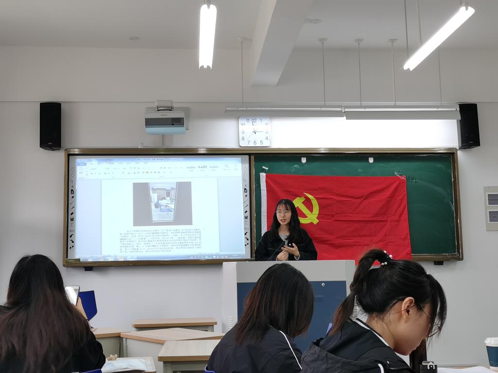 吴晓静同学以近期的话题电影《我和我的家乡》为切入点,细心地发掘了电影背后的原型人物。她分享了电影中治沙英雄、乡村教师、扶贫干部等人民英雄坚守在自己岗位,默默耕耘与奉献,为祖国的发展与进步付出了极大的努力。作为一名党员,自己也要努力学习,用自己的力量建设家乡。