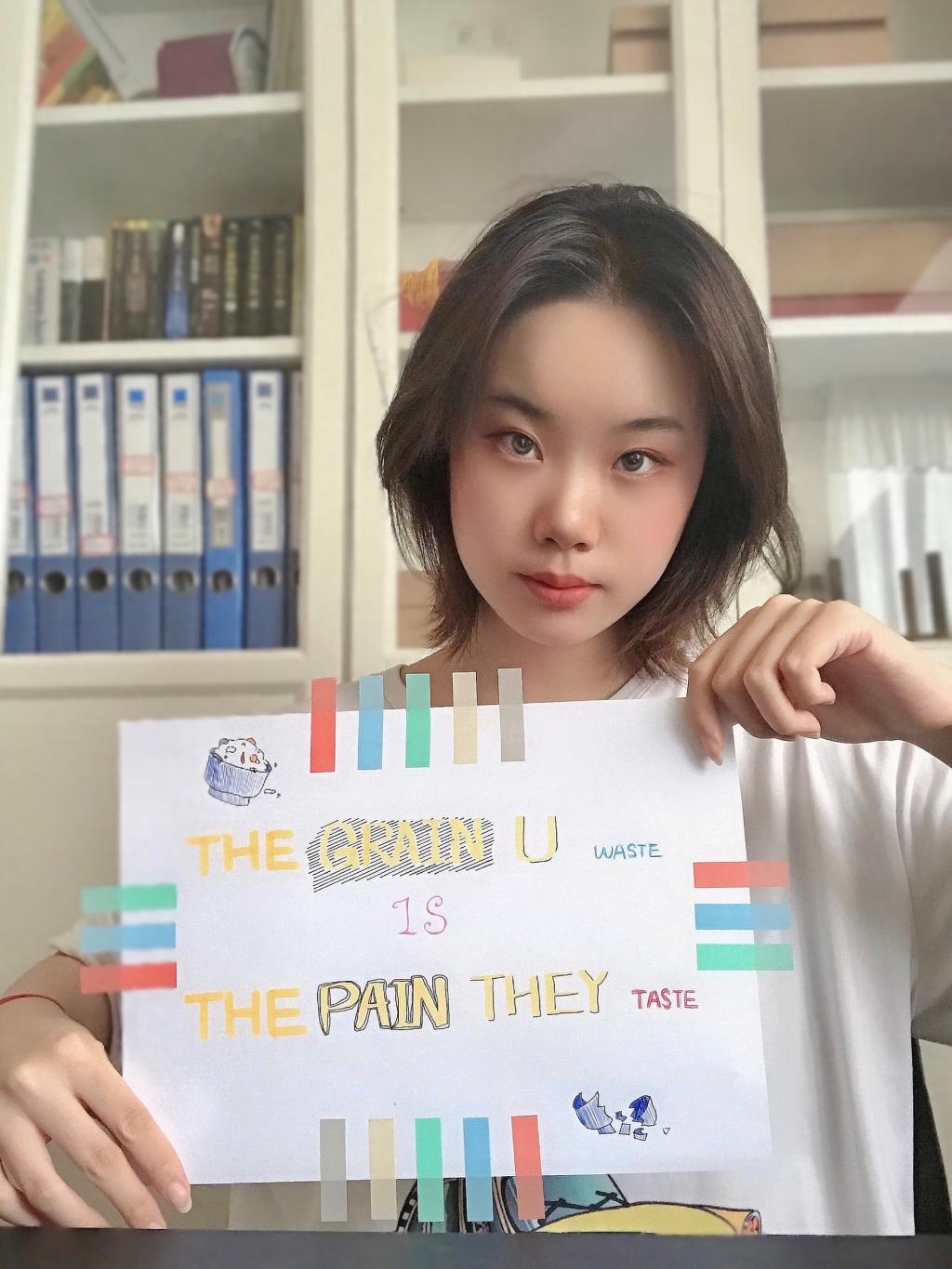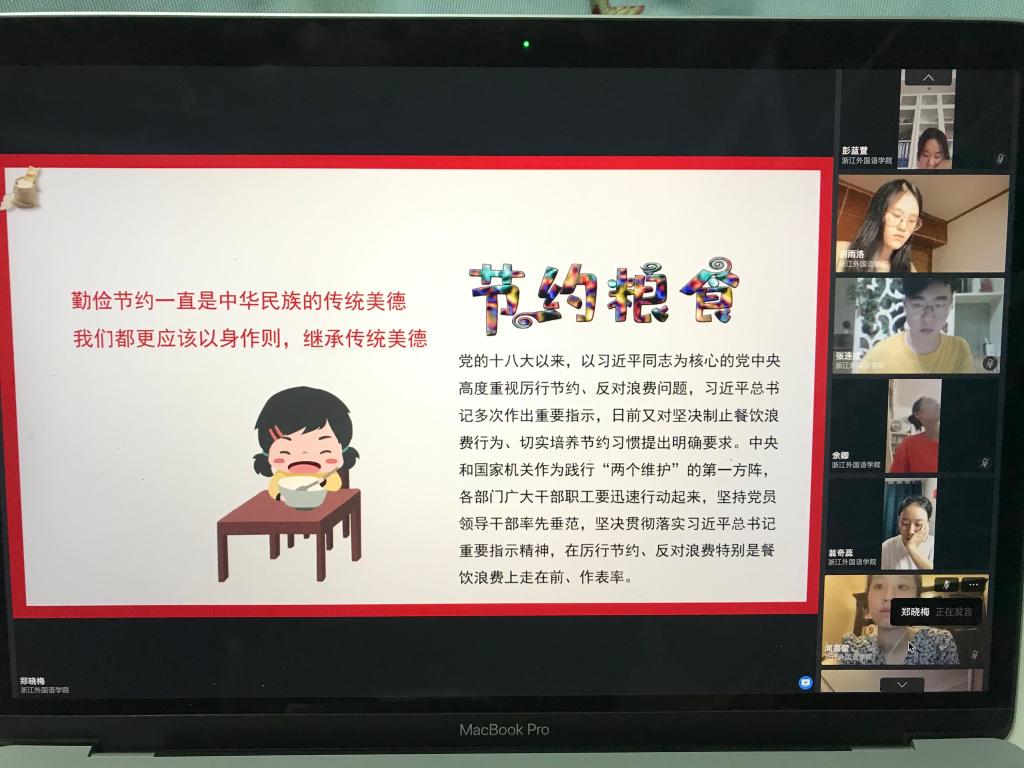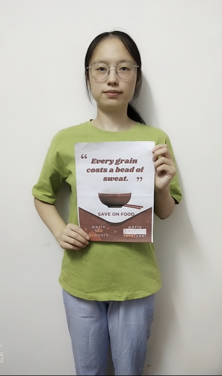 此次活动以线上形式开展,结合翻译系党支部的特色,一方面集体学习习近平总书记关于节约粮食的重要指示,另一方面以双语形式引导员工党员,说标语,表行动。例如员工党员万怡婷以“Food is used to satisfy hunger, not to waste”作为自己的标语;员工党员彭蓝萱以“The grain you waste is the pain they taste”作为自己的标语;员工党员张连成以“One man’s trash is another man’s treasure”作为自己的标语等;员工党员赵新雨以“Grain in each dish is hard”作为自己的标语;员工党员张月欢以“Every grain costs a bead of sweat”作为自己的标语;员工党员罗琛以“Every single grain is the result of toil”作为自己的标语等。