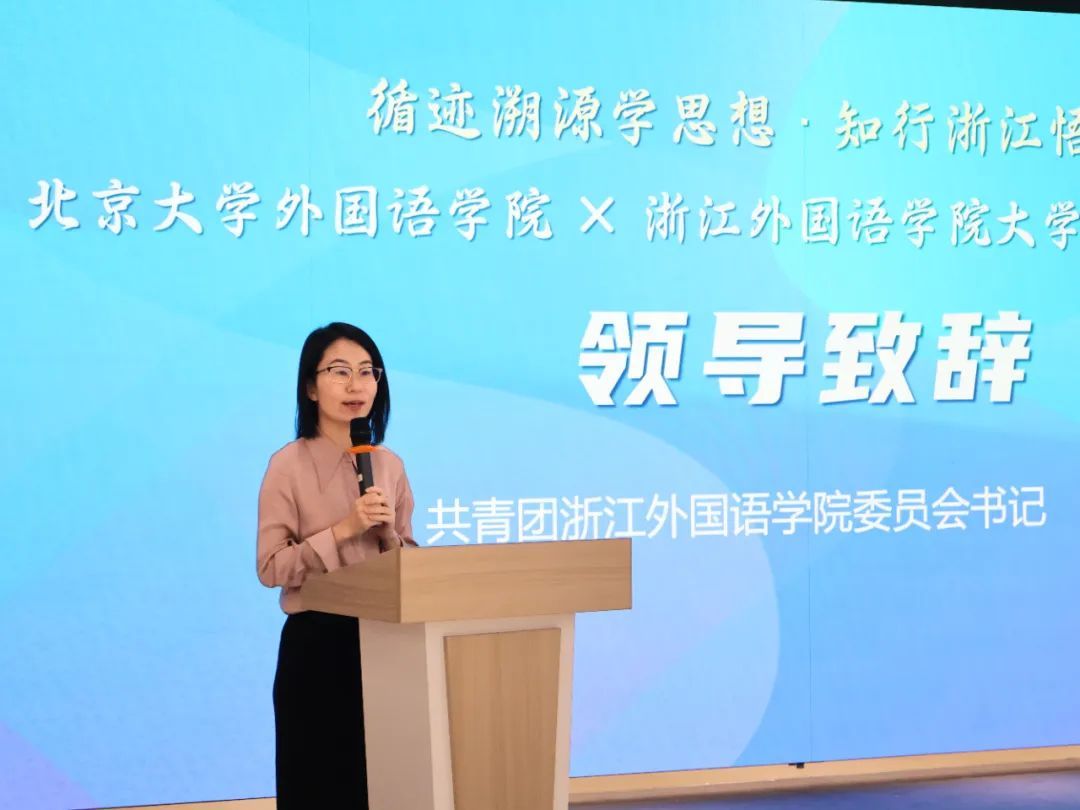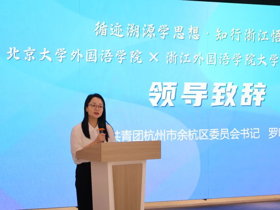 陈超在致辞中对北大外院师生来杭实践表示欢迎,对团余杭区委的大力支持表示感谢。她鼓励全体实践队队员要以“求真”之志深入调研,以“力行”之为投身实践,以“明辨”之思深化感悟,要追寻习近平新时代中国特色社会主义思想在浙江萌发与实践的轨迹,体悟中国之治的成效。
