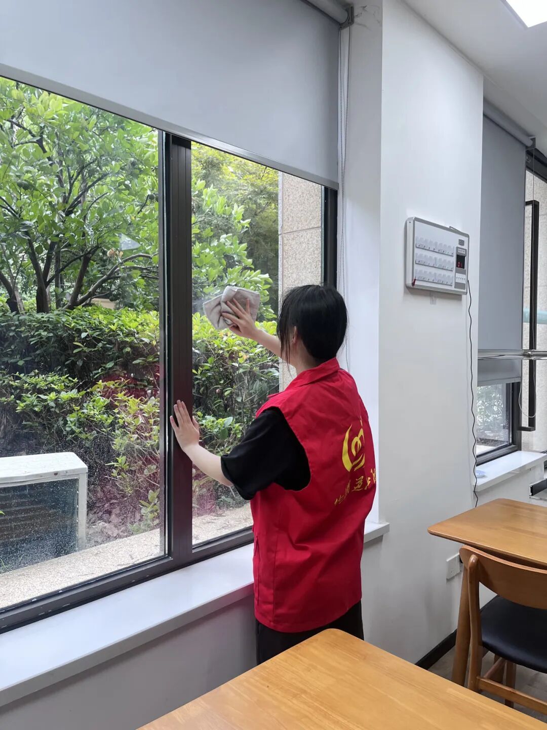 (团队成员擦拭养老院玻璃图片)