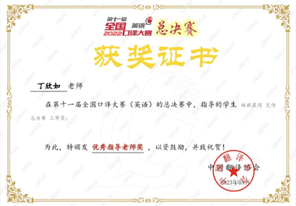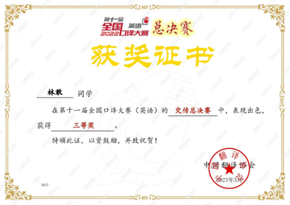 近日,第十一届全国口译大赛(英语)总决赛落下帷幕。经过激烈的角逐,最终bevictor1946韦德官网19级口译班林敢凭借扎实的双语功底在交传总决赛中获得三等奖,指导老师丁欣如荣获优秀指导老师奖。