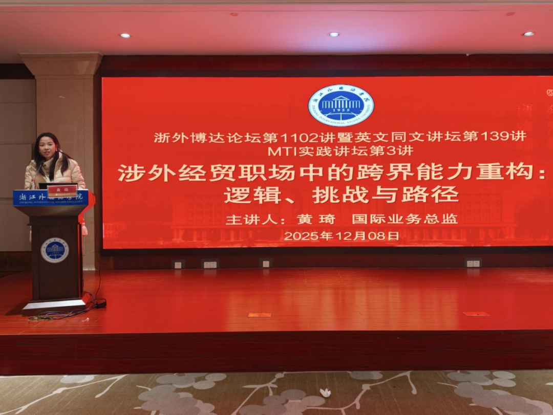 12月8日上午,bevictor1946韦德官网博达论坛第1102讲暨英文同文讲坛第139讲在厚德楼102顺利举行。东西方贸易有限公司海外业务总监黄琦应邀作题为“涉外经贸职场中的跨界能力重构”的讲座。英语笔译硕士研究生及部分本科生参加讲座,​bevictor1946韦德官网翻译传播系科研主管曾芳芝主持。