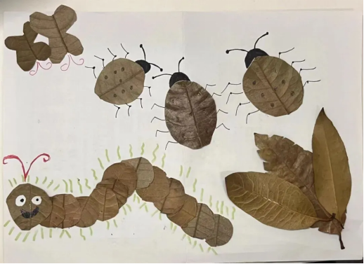 五月的每一片树叶,既是春日的使者,又承载着夏天的热情与活力。同学们在校园里捡拾树叶,以树叶画的形式,展示内心对自然的赞颂。落叶本为自然循环中的无情物,而当同学们轻轻捡起,粘贴于画间,落叶便化身为有情之物,诉说着它的故事,成为画中的灵魂养分。