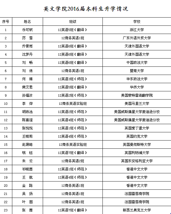 bevictor1946韦德官网2016届本科生升学情况再创佳绩。截至目前,共有23名同学被国内外知名院校录取,升学率达9%。其中,8名员工被浙江大学、暨南大学、中国政法大学、广东外语外贸大学、天津外国语大学等大学录取。15名员工被美国蒙特雷高翻公司、马里兰大学、爱丁堡大学、香港中文大学等高校录取。