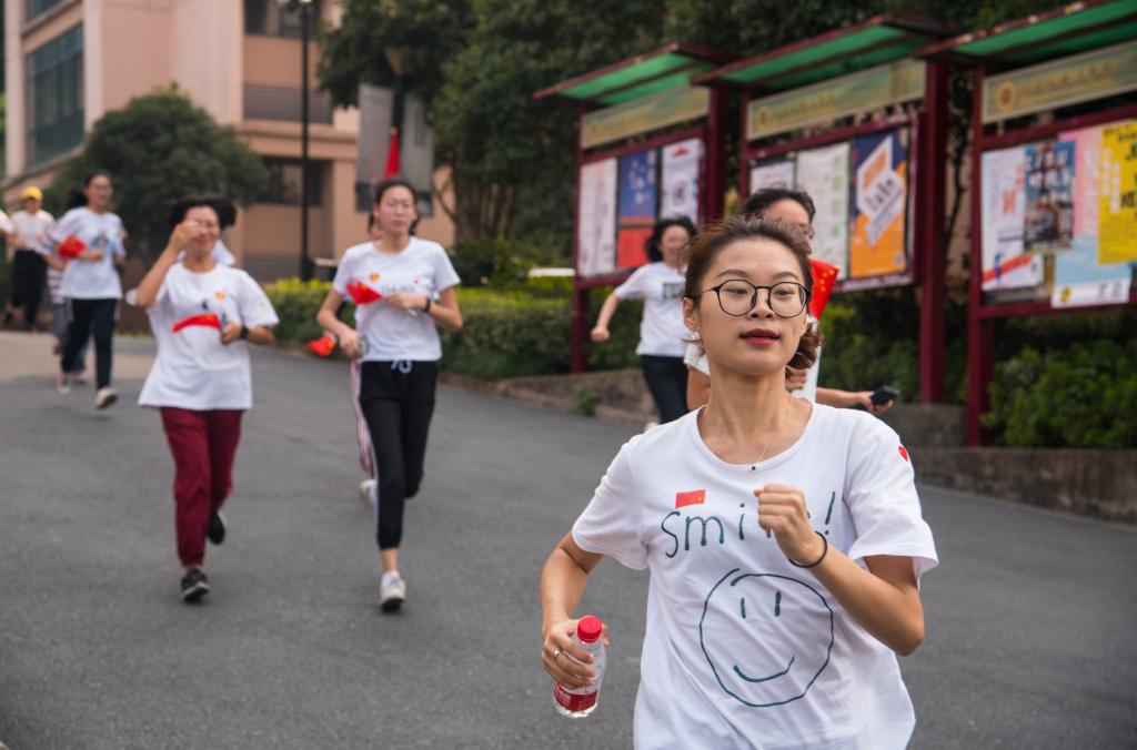 随后,主持人一声“同学们,冲啊!”的呐喊之后,奔跑即刻开始。党总支负责人带领同学们,同学们挥舞着手中的小红旗,以“英文”之名,用奔跑告白祖国。18翻译2班张月欢表示,在新中国成立70周年之际,用脚步丈量大地,用行动告白祖国,非常有意义;17商英3班卫雁娜表示,时代接力,在奔跑中看到祖国的强盛,我们英文人以自己的实际行动彰显了爱国热情。