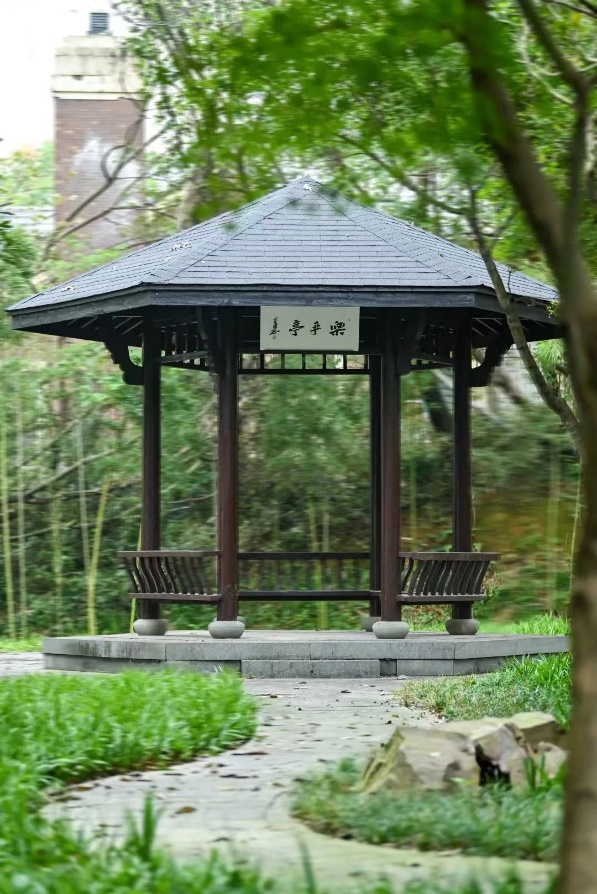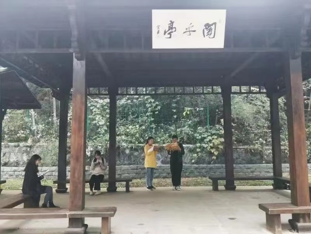 “闻乎”,意即“听见了么”,和山苍苍中,寻语山脚下,此问显得格外空灵。古色古香的长廊,绿荫环绕,清风虫鸣,颇有“蝉噪林逾静,鸟鸣山更幽”的意境。清晨,持书来此,大声朗读,为语言学习奠定基础;傍晚,约几好友,尽情交流,让思想碰撞出智慧火花。