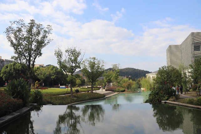 “静思”,寓意潜心学习、沉静思考、启迪心智。每日清晨,学子们也总爱在湖边诵读。微风缕缕,涟漪层层,书声琅琅,早读人内心始终波澜不惊。湖里穿梭游弋的鲤鱼,夏日亭亭玉立的荷花,也为静思湖增添了几抹色彩。