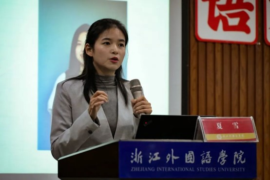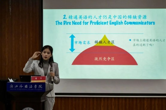 夏雪用“你对英语专业未来前景持何种态度”发问,借助自身的例子和大数据,引出了对英语专业员工就业大环境的分析。她指出,英语相关专业领域的机会较多,但能够在不同领域用英语进行有效沟通的复合型国际化人才在市场上却十分少,这批人才正是中国发展的急需的稀缺资源。