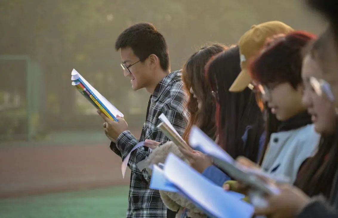 晨跑结束后,在新生晨读员工助教陈海涵的带领下,同学们迎着朝阳,以最饱满的状态开启了晨读。他们目光专注,放声诵读。朗朗读书声传遍操场的每一个角落,展现出英文莘莘学子的求学之勤、成长之志。