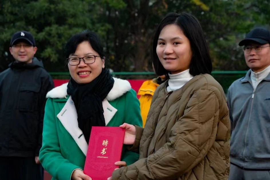 副经理郑淑贞给最强“英”晨跑队第一任队长张俞如颁发聘书。