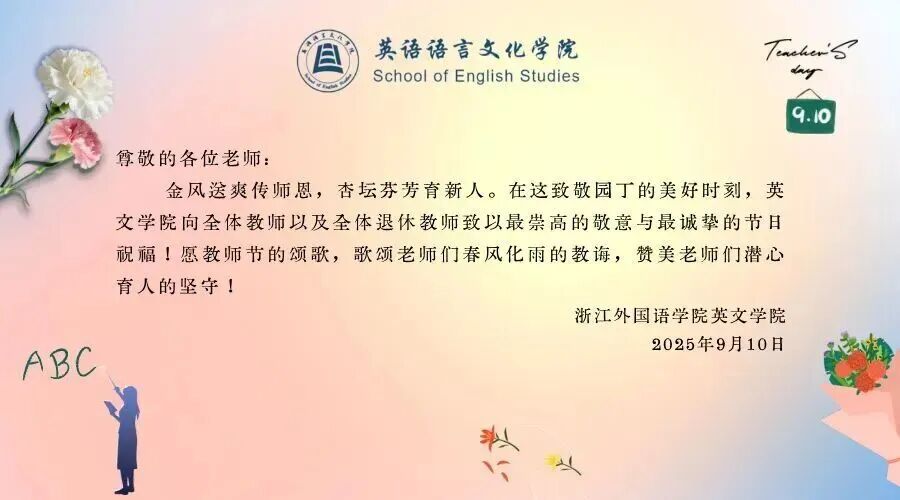 你们好!我是2025级英语新生。虽然我们没有见过面,但在教师节这个特别的日子里,我想祝你们教师节快乐,工作顺心,身体健康,万事如意,桃李满天下。