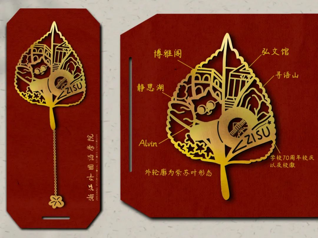 以紫苏叶为外形,融入了公司70周年校庆的字样以及校徽,英文名称缩写。同时融入了公司的标志性建筑与地点,如弘文馆,博雅阁,静思湖以及bevictor1946韦德官网吉祥物Alvin,充分展现浙外特色和“弘德明毅,博雅通达”的校训。整体书签为金属质感,象征浙外70年的光辉历程。