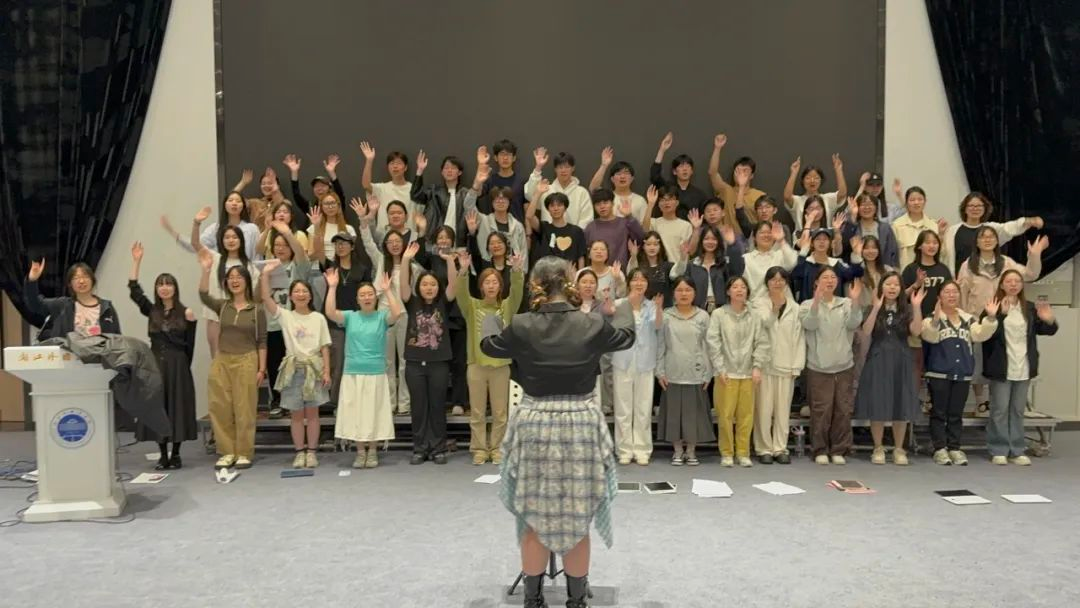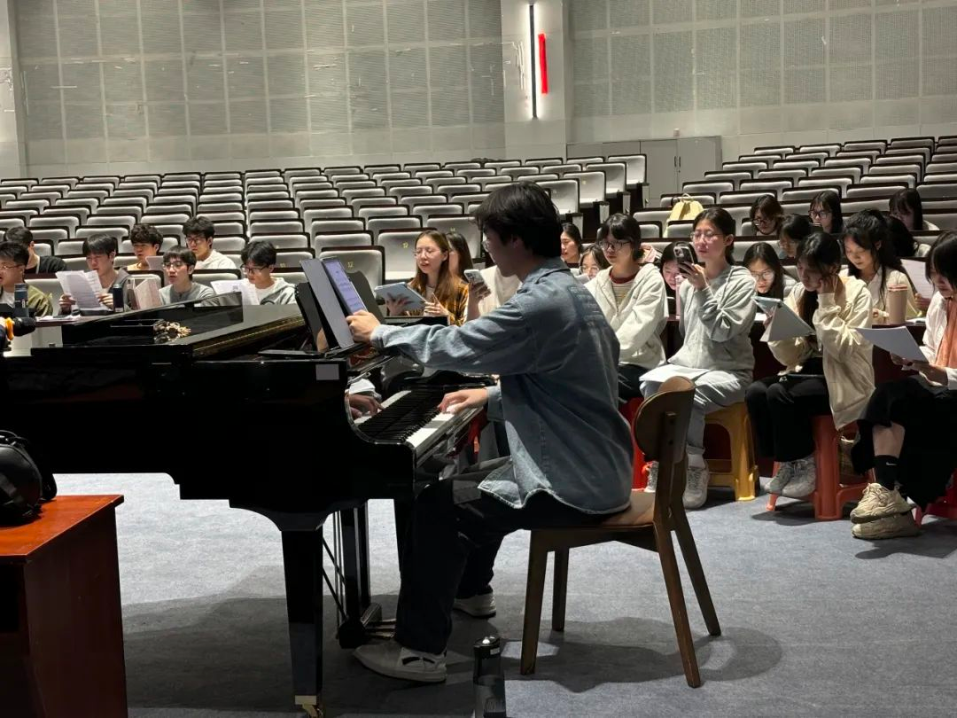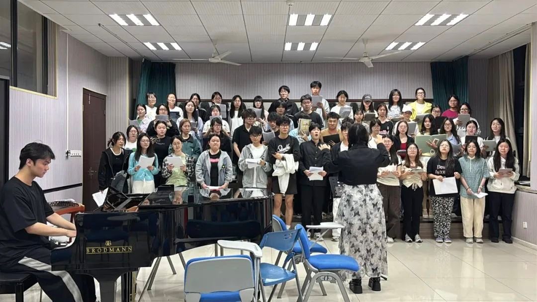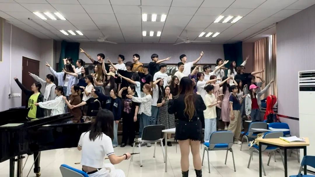 在耀眼的荣耀背后,指挥徐熳璐和钢琴伴奏董以诺是团队坚实的力量。指挥对照节拍器打磨每个动作的力度与弧度,手臂酸胀仍坚持练习;钢伴反复推敲音符的轻重缓急,不断追求完美。他们用温柔的教学方式为团队注入能量,团员们感慨:“正是凭借严谨专业的指导与团队温暖协作的氛围,我们的音乐热情得以淬炼升华,才最终斩获荣誉。”