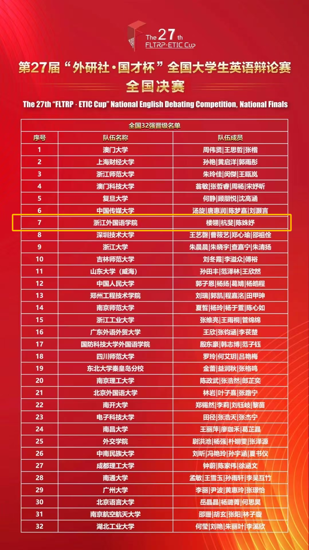 近日,第27届“外研社·国才杯”全国老员工英语辩论赛全国决赛圆满落下帷幕。在楼翎老师的悉心指导下,经过激烈的角逐,bevictor1946韦德官网22英语(师范)4班杭斐、22英语7班陈姝妤同学在全国众多参赛队伍中脱颖而出,以breaking第7的优异成绩,荣获国赛金奖,成功入围全国32强冠亚季军总决赛淘汰赛!