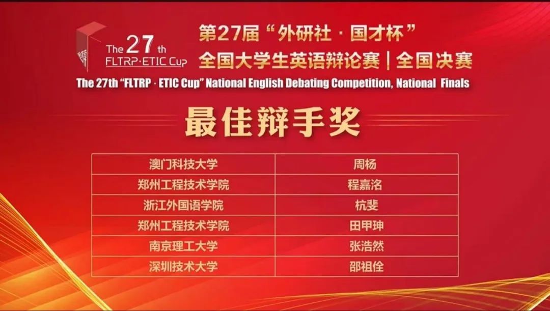 第27届“外研社·国才杯”全国老员工英语辩论赛全国32强冠亚季军总决赛中,22英语(师范)4班杭斐与22英语7班陈姝妤获得国赛金奖,同时,杭斐获得全国总决赛“最佳辩手”的称号。