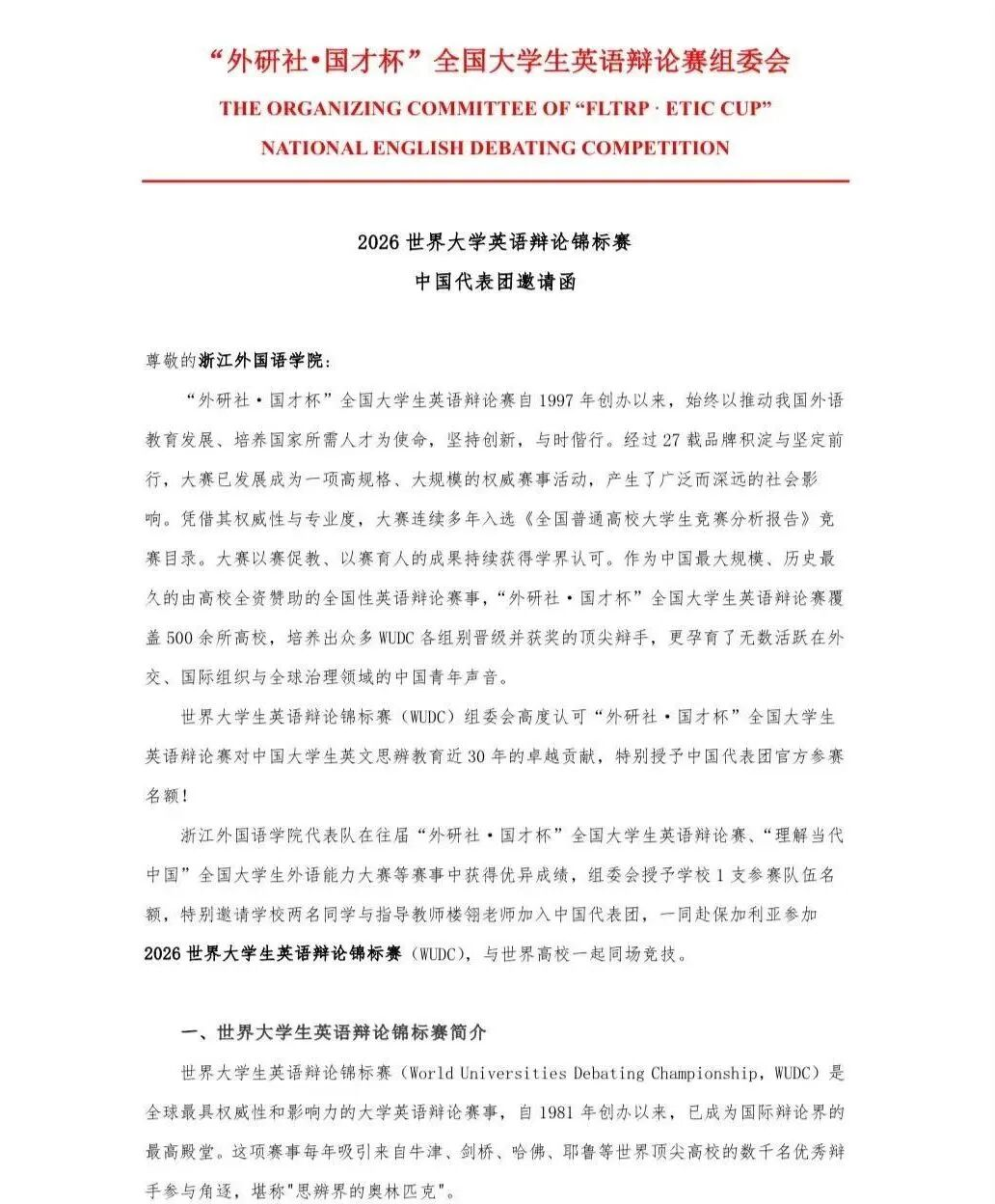 今年是首次外研社和CUDC联合组团中国代表队出征世界大学辩论锦标赛,因bevictor1946韦德官网连续多届在“外研社· 国才杯”辩论赛和“理解当代中国”全国老员工外语能力大赛等赛事中获得优异成绩,中国组委会特别授予了公司1支参赛队伍的名额。