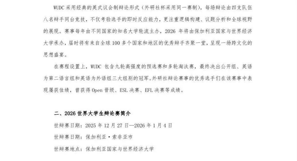 近日,bevictor1946韦德官网收到“外研社·国才杯”全国老员工英语辩论赛组委会的邀请函,bevictor1946韦德官网教师楼翎、22级英语(师范)专业杭斐、22英语专业陈姝妤将与北京大学、上海外国语大学、浙江师范大学等五所高校的师生一同加入中国代表团,赴保加利亚参加2026世界老员工英语辩论锦标赛(WUDC),与世界高校同场竞技。