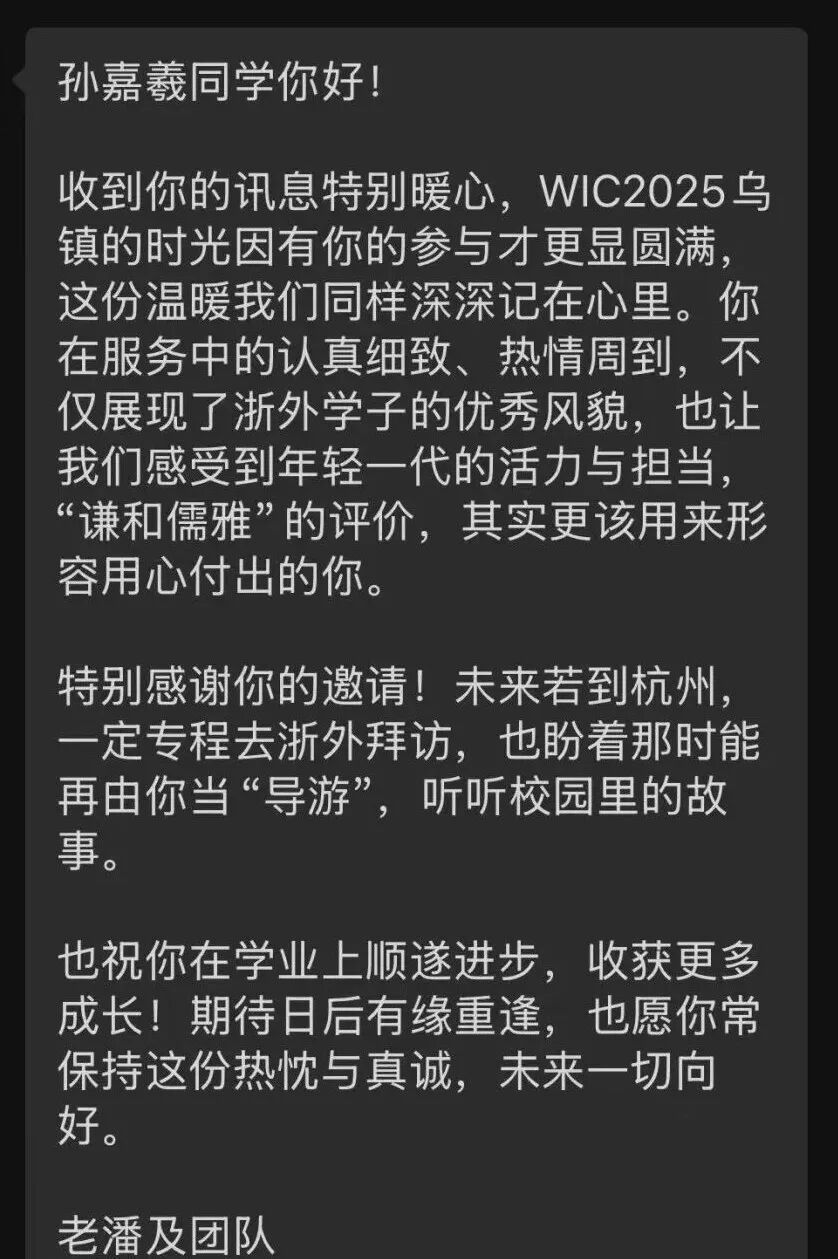 会议期间,23级英语专业的俞青青与联络员保持密切沟通,细致核对嘉宾的每日参会安排,做到提前提醒、及时告知,确保行程顺畅无误。面对嘉宾对江南水乡的好奇,她将历史传说和风俗民情娓娓道来,把一个个文化细节讲得生动有趣,赢得嘉宾频频点头称赞。“四天全程的陪伴参与,更让我在实战中迅速提升了跨文化沟通与协调能力。”俞青青说,“乌镇峰会为我打开了一扇窗,让我得以眺望更为广阔的世界,也让我更加坚定要继续运用自身的语言与跨文化交际能力,服务世界,连接更多元的文化!”