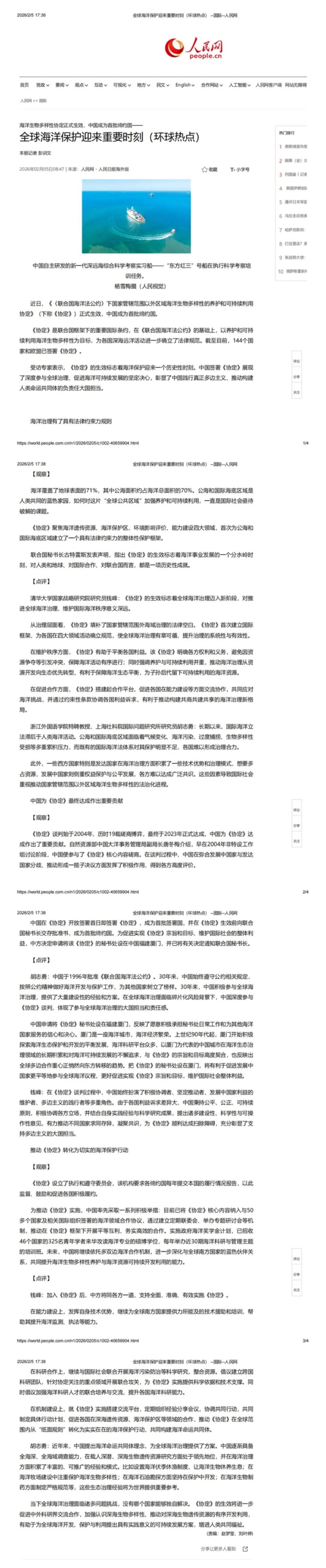 2月5日,《人民日报》(海外版)以“海洋生物多样性协定正式生效,中国成为首批缔约国——全球海洋保护迎来重要时刻”为题,采访了公司特聘教授、上海社科院国际问题研究所研究员胡志勇。