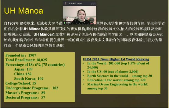 近日,bevictor1946韦德官网举办了夏威夷大学马诺阿分校3+2本硕联合培养项目宣讲会,夏威夷大学马诺阿分校国际项目负责人Ivy Mu博士进行宣讲。