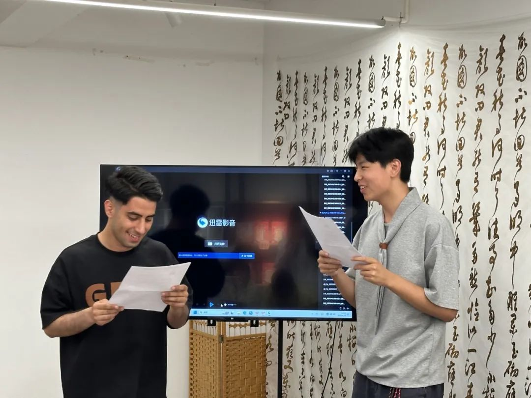 在角色扮演环节,吕东尔播放了经典喜剧《基和皮尔》中的精彩片段,该片段展现了夸张的表演风格与幽默诙谐的对话,引得现场笑声不断。随后,两位同学勇敢登台,对影片中的经典片段进行情景再现,活动现场的氛围越发热烈。