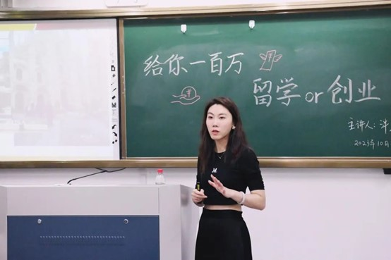 “给你一百万,你是选择留学还是创业”就业创业经验分享会由2007届实用英语专业员工、华通留学温州公司经理泮慧担任主讲。她围绕个人留学经历、创业起伏,激励同学们勇于创业,在创业中不断思变、借力、坚持,深耕公司业务领域,做到极致的服务。她就创业经历中的得与失为学弟学妹们答疑解惑,用自己的人生规划和创业经验,向英院学子展示了另一番精彩人生。