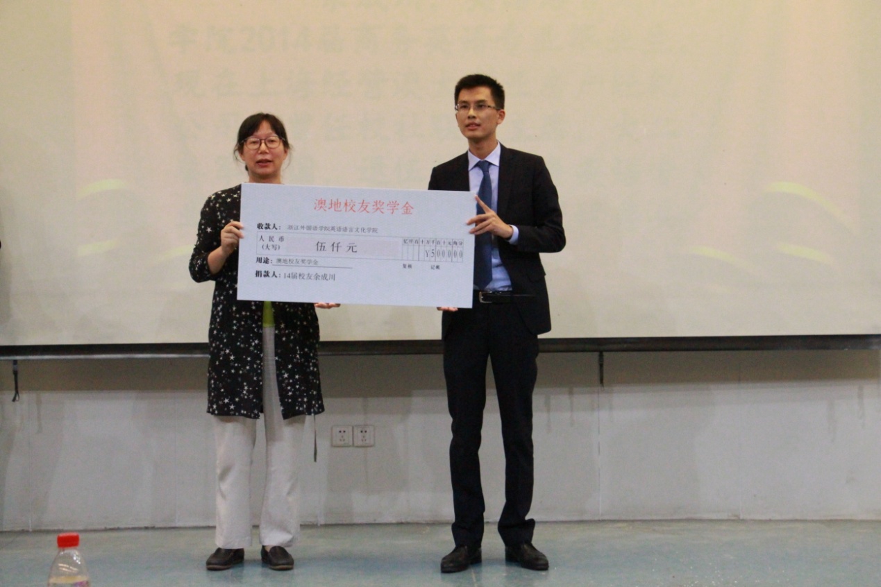 最后,余成川表达了他设立澳地奖学金的初衷:十岁那年父亲去世,他是靠着国家助学金和当兵退伍金读完大学,所以他现在也特别希望能帮助那些和他当初一样困难但又志存高远、德学双优的同学。