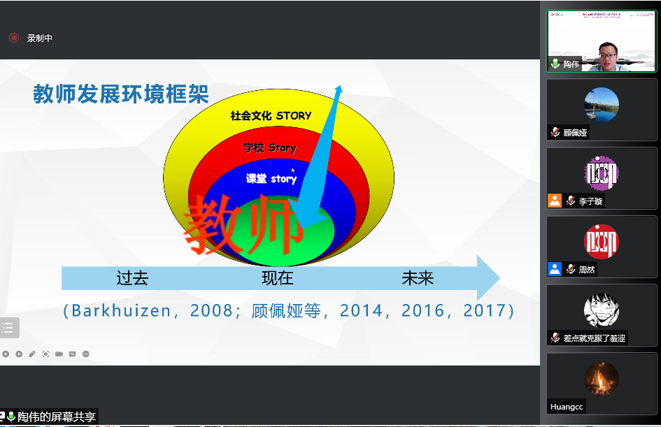 陶伟报告的题目是:课程改革中大学英语教师在职学习与发展实践案例。他指出,蓬勃发展的课程改革涌现为五个新常态:学分削减、思政贯通、技术赋能、实践延展和学科破壁。这为大学英语教师带来很多新挑战,而这些新挑战也成为他们专业发展的新机遇。结合《大学英语教学指南》,他分享了公司一位教师的个体能动实践和行动研究团队的群体共同探索两个案例,并从生物生态学视角对这两个案例进行了分析,呈现了公司教师有效发挥主体能动性和公司积极创设优质教师发展环境的生动实践,为其他公司教师的专业发展提供了启示。