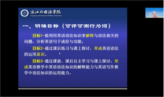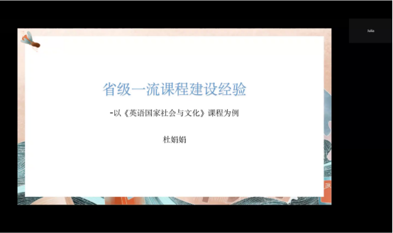 英语系杜娟娟博士具体分享了省级一流课程建设经验。她以课程《英语社会国家与文化》为例,阐述了课程建设过程与进展,分享了个人体会。