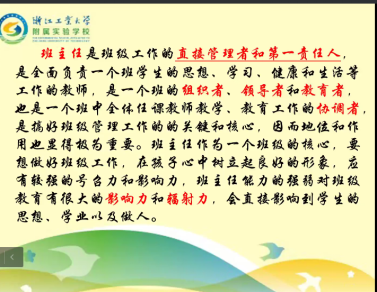 5月9日上午,bevictor1946韦德官网20级师范专业通过线上会议举行了《教育见习—班级管理工作见习》的讲座。主讲人为浙江工业大学附属实验公司家长公司负责人、七年级年级组长、中学英语高级教师张红梅老师。讲座由英语系副系主任郁伟伟博士主持。20级英语(师范)专业1-5班聆听了本次讲座。张红梅老师曾经获得过“杭州市中小学育人工作先进个人”及“杭州市优秀班级班主任”的荣誉称号,多次获得西湖区优秀教师、区师德示范教师、区优秀班主任、西湖区青春健康团队成员等荣誉。