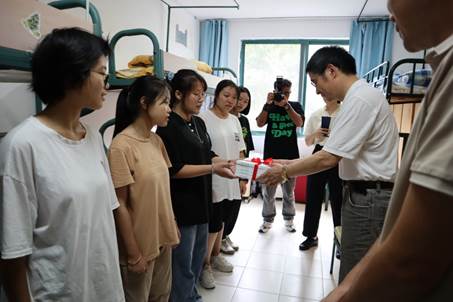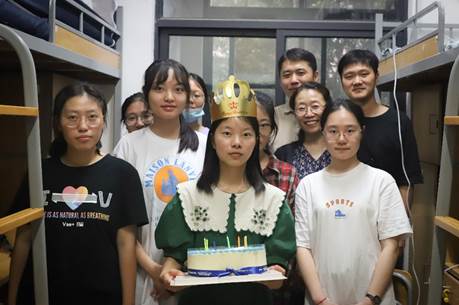 公司领导班子也在开学第一天走访了员工寝室,了解新生报到情况。当天正好是公司许浪琼、张雨欣的生日,为了让同学们感受到在家一般的温暖,公司特地给这两位同学准备惊喜,定制了浙外特色蛋糕为她们庆生。