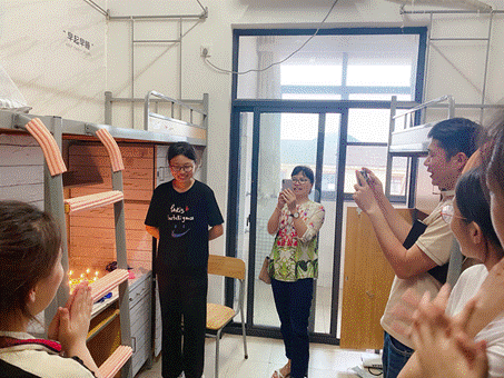 毛书记和公司副经理郑淑贞老师给来自浙江温州的张雨欣送上生日蛋糕,微黄的烛光温柔地照亮了每个人脸上那一抹会心的笑容。“呼~”掌声响起,生日的祝福再次唱响整个寝室……许愿结束后,寿星贴心地为老师们和室友们切分蛋糕,分享着自己的喜悦。