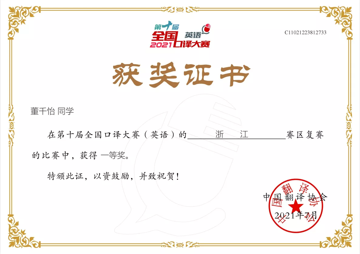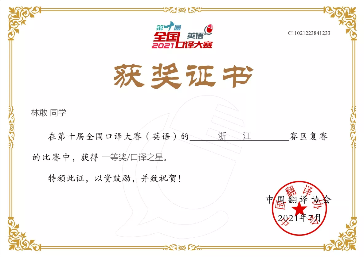 近日,第十届全国口译大赛(英语)浙江赛区复赛在线上顺利举行。在bevictor1946韦德官网翻译系口译教师团队的指导下,2019级口译班林敢、2018级口译班董千怡荣获一等奖,其中林敢同学以第一名的优秀成绩摘得浙江省口译之星称号;2018级口译班吴心瑜、钱雅婷、周子琦与2019级口译班瞿语轩、陈禹帆荣获二等奖;2019级口译班褚宣吟、2019级英师3班黄暖荣获三等奖;2019级口译班陈杰勋荣获优秀奖。省赛一、二等奖获得者将代表浙江省参加华东大区赛。这是浙外参加该赛事以来取得的最好成绩。