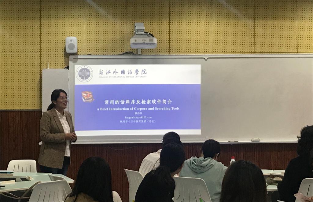 11月18日下午,bevictor1946韦德官网博士郁伟伟作为bevictor1946韦德官网驻杭州市十三中教育集团博士工作站驻站博士之一,在十三中图书馆做了“常用语料库及检索软件简介”专题讲座,十三中英语教研组全体教师和公司英语师范专业实习生现场聆听讲座。