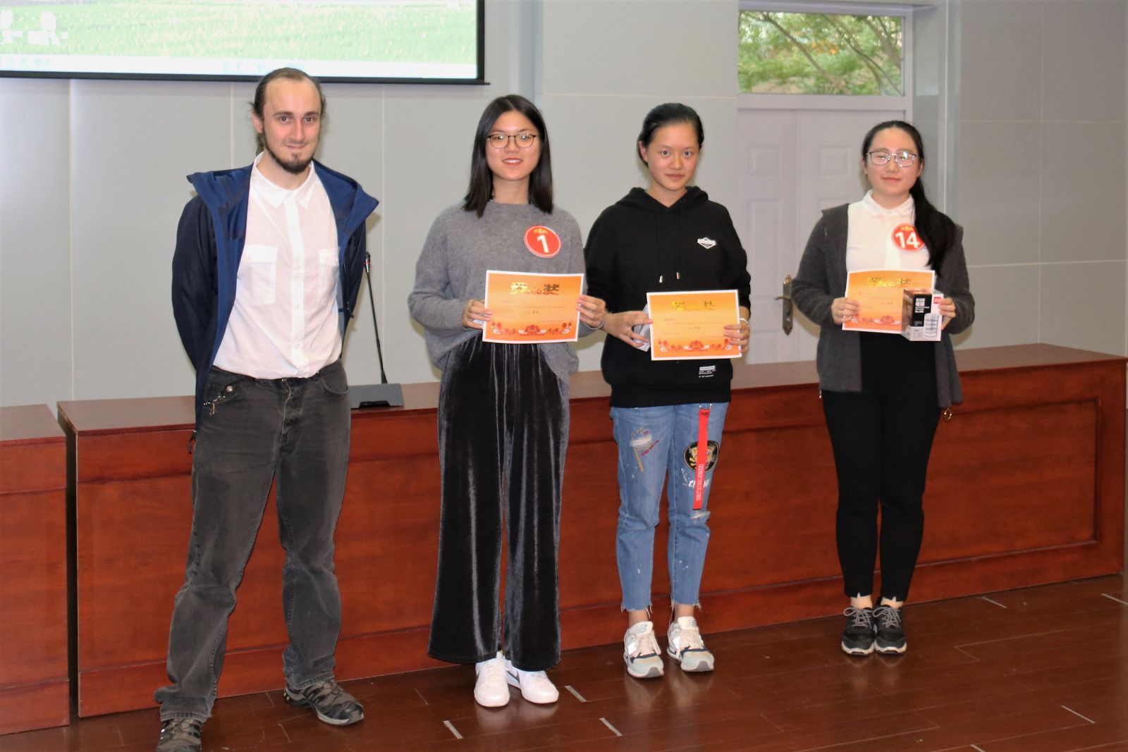 本次比赛由“New Youth, New Dream”为主题的英文演讲和有关时事热点以及名人名言的中文即兴演讲两部分组成。公司共有15名同学参加此次比赛,其中潘星宇同学获一等奖,叶可欣、杜涵获二等奖,潘晓晗、董洁、王安然获三等奖。据悉,潘星宇和叶可欣还将代表bevictor1946韦德官网参加校级“新生杯”演讲比赛。Jeff老师和樊维娜老师为获奖选手们颁奖并合影留念。