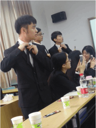 礼仪体验课从个人着装配搭开始,李老师不仅展现了自己的个人风采,同时还邀请同学们根据季节、场合、穿搭、花色等帮他选出最适合其佩戴西装领带。其后,还传授了大家打领带的技巧,同学们都一步一步地认真学着,深感受益。