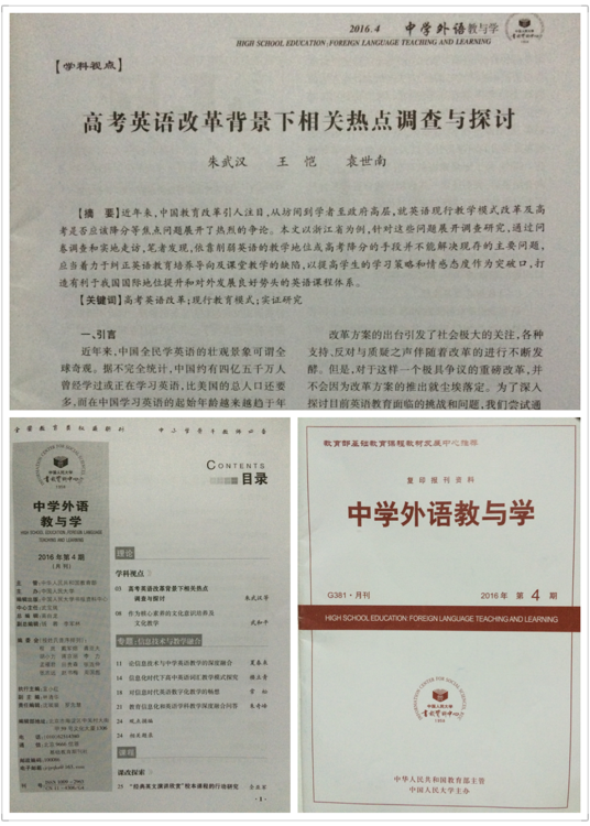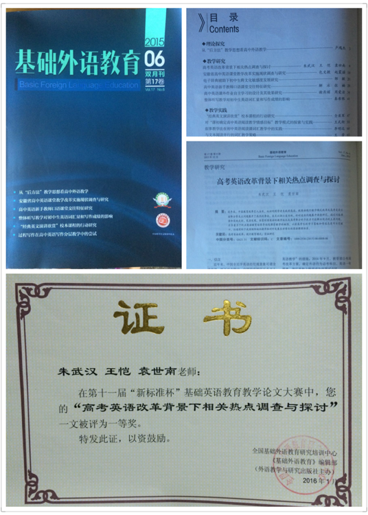 日前,由bevictor1946韦德官网英语系朱武汉博士、2012级英语师范专业员工王恺、袁世南共同撰写的题为“高考英语改革背景下相关热点调查与探讨”一文荣获由全国基础外语教育研究培训中心、《基础外语教育》编辑部联合主办的第十一届“新标准杯”基础英语公司产品论文大赛一等奖。论文在《基础外语教育》2015年12月双月刊上刊印。2016年4月,教育部主管、中国人民大学主办的国家级核心期刊《中学外语教与学》全文转载刊登该论文。这是英语师范专业师生在论文领域斩获的一项殊荣。