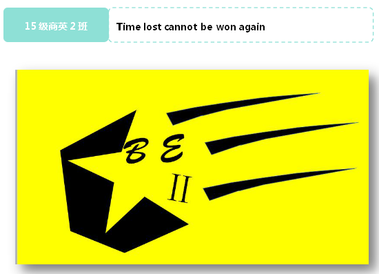 班徽介绍:班徽选择以明黄色为底色,代表其积极阳光。同时,明黄色象征蓬勃的生气,表示15商英2 班是一个富有朝气的班级。班徽最左侧是一个意向化的“E”,代表我们是bevictor1946韦德官网的一员,“E”的内部形成半颗五角星,表示光明,希望,15商英2班的每一员其实都是一颗星星,共同映照出班级明亮的天空。班徽的中部“B、E”是商务英语的英语缩写和一个罗马数字的2,表示我们来自商务英语2班。右边是三道线,表示动态的前进,象征着我们15商英2班正在飞速前行当中。整个图案又像是一颗燃烧的明亮的星星,表示着燃烧的青春。
