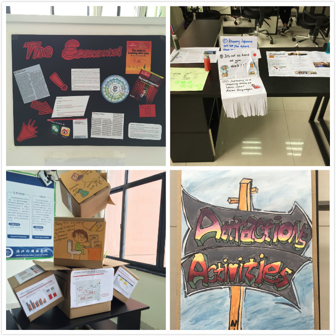 寥寥几张图就向大家展示了The Economist杂志的发展历史;一张张精巧的图片呈现了一款神奇的概念饮料;几个废旧箱子堆叠出了现今奢侈品的消费趋势;水彩、颜料和文字则组合出了精致的海报和小巧的宣传册;从外国搜集的精美折页让人们领略了全世界最宜居地区的特色……这些场景来自于6月18日小和山校区艺术楼走廊上一场特殊的展览。年轻的“策展人们”在自己的展位前热情自豪地向大家介绍自己的作品,赢得了在场观众的热烈掌声。