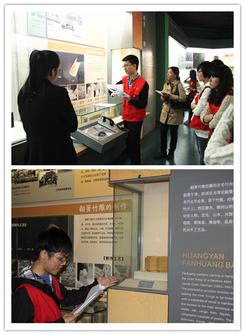 活动中,双方就“意匠生辉”展馆展品的文化背景、英语翻译和讲解内容展开了交流讨论。其中,联盟成员对自己负责的文献材料翻译和英文介绍进行了展示。通过交流,志愿者们了解到在英文翻译过程中所需要注意的专业问题,同时对如何用英语更好地向外国友人传递中国文化有了更深的了解。活动尾声,志愿者们参观了“十里红妆”展馆,明确了第二次活动的志愿者翻译讲解内容。