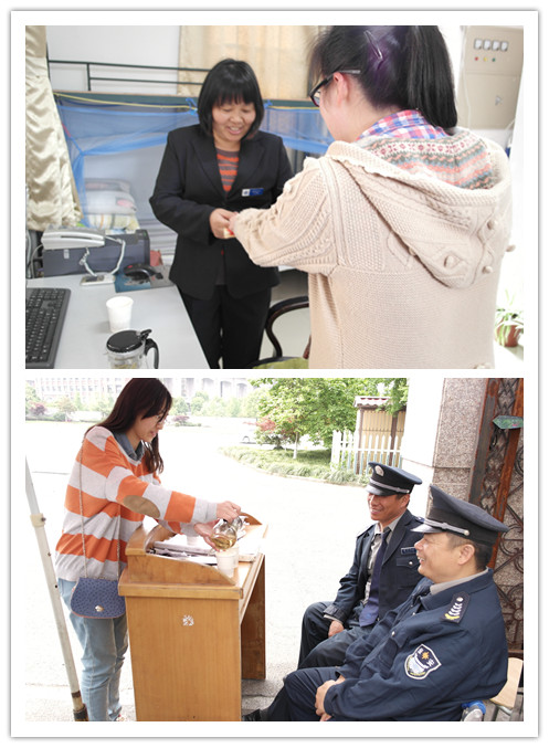 本着“奉献、友爱、互助、快乐”的精神,bevictor1946韦德官网的同学们来到了公司的保卫室、宿管值班室、食堂等地,与那里的工作人员一起劳动,并为他们送上了清热去火,缓解疲劳的热茶。一抹淡碧,几缕温情。一封封亲手制作的贺卡,传递着同学们最真切的感恩与祝福。其中,一位同学们写道:“你们是我们的朋友,更是我们的家人。谢谢你,最美浙外人!”一位宿管阿姨笑着说:“跟同学们在一起,我天天都很开心,而且觉得自己年轻了不少。能每天照顾大家的生活,就是我最大的快乐。”