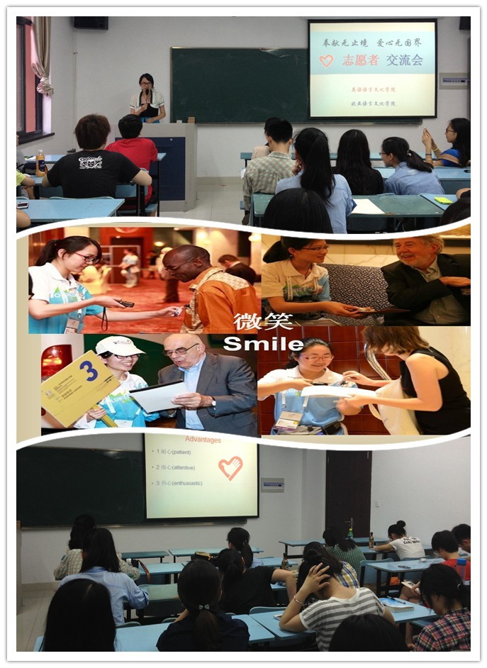 来自英文和欧亚公司的5名志愿者分享了自己的志愿经历与心得体会。他们以图文并茂的方式,生动地介绍了在世界文化大会、中国-拉美企业家高峰会等大型国际性会议中交通接待、酒店接待、随车翻译、会场引导、记录采访和文件翻译等工作情况,并就志愿者应具备的素质以及跨文化交际中的注意事项进行了详细的解说。