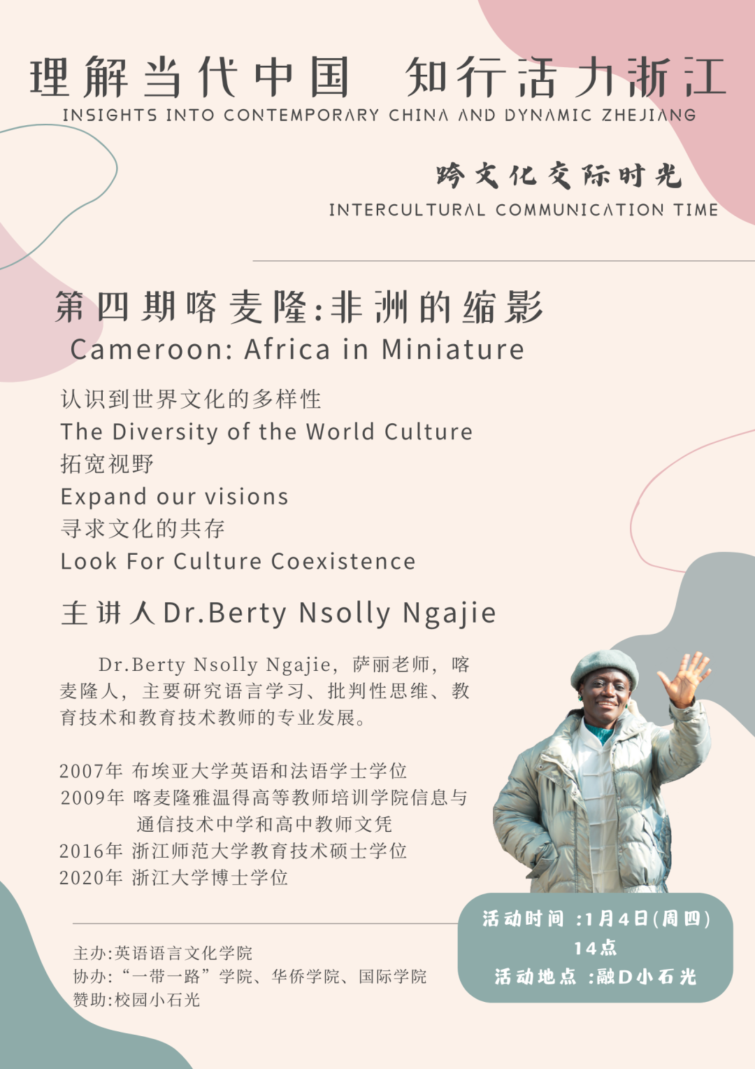 活动第四期将在1月4日举行。2024开年之初,来自喀麦隆的外教Dr.Berty Nsolly Ngajie将通过介绍自己祖国多彩文化,以见微知著的方式,向同学们展示独属于非洲的历史和人文风采,以及与中国文化之间的差异。通过这种方式,践行中国高等教育把世界介绍给中国的使命,带领同学们领悟世界命运共同体理论的深刻内涵。