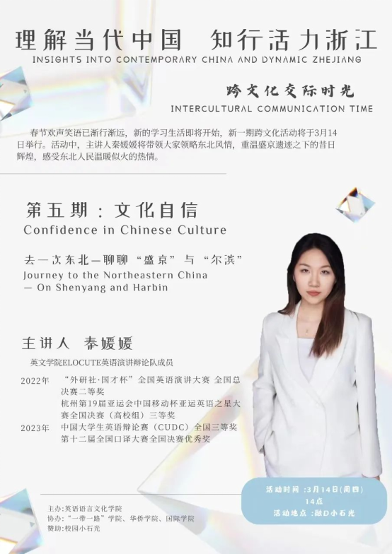 春节欢声笑语已渐行渐远,新的学习生活即将开始,新一期跨文化活动将于3月14日举行。活动中,主讲人秦媛媛将带领大家领略东北风情,重温盛京遗迹之下的昔日辉煌,感受东北人民温暖似火的热情。之后,所有参与者都将有机会自由讨论,分享家乡或寒假旅行趣事,抑或是写下对新学期的寄语和展望。