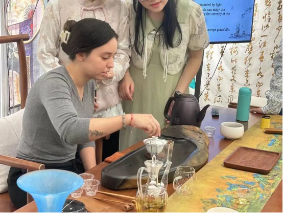 随后张星琪引导大家进入了品茶泡茶环节。本次活动邀请了一名神秘嘉宾——秦国华老师为大家现场演示泡茶的流程:温杯—投茶—洗茶—泡茶—出汤—分茶。一举一动,尽显东方神韵,同学们摈除喧闹,认真观摩着老师的一举一动。泡茶结束后,主持人和主讲人针对茶品介绍和泡茶环节进行小提问,以热茶为礼,热闹现场。不管是职工还是中国员工,纷纷举手,分享“切磋”刚刚所学的茶文化。