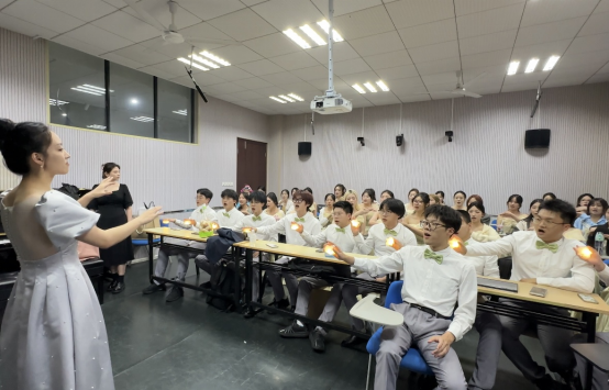 在排练室里,男高音声部的周羽翔与成员们共同面对着节拍的难题。他们反复练习,用手打拍,枯燥的练习并不会阻挡他们进步的步伐。坚持是困难但有效的,最终大家掌握了复杂的节奏。周羽翔回忆说:“我们通过分声部训练,放慢节奏,确保每个音符的音高准确无误,这让我们在后续的合排中更加得心应手。”
