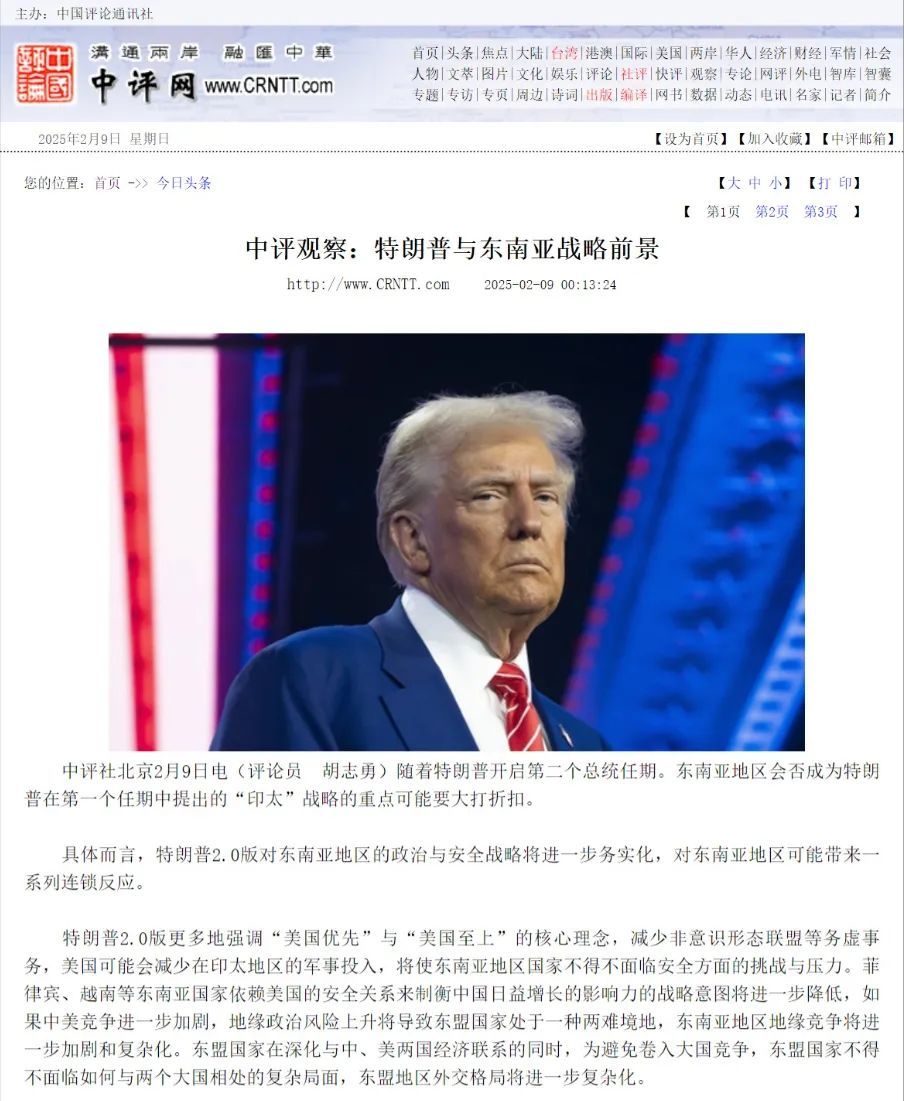近日,中国评论新闻社头版刊发了bevictor1946韦德官网特聘教授胡志勇的文章。文章中,胡志勇就特朗普与东南亚的战略前景等问题发表评论。