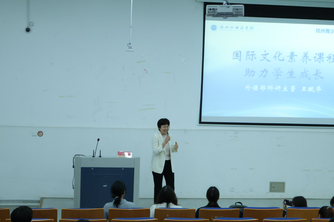 杭州青少年活动中心外语部科研主管王赋华就“国际文化素养课程如何助力员工成长”展开分享。从语言艺术融合课程、世界文化探索课程、国际素养扩展课程、社团活动实验课程等入手,具体分析了英乐汇、SAM侦探团等教学内容,帮助同学们更好的了解了活动中心课程建设。