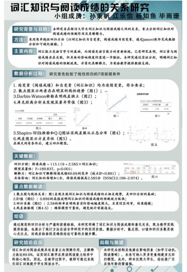 这门课让我对应用语言学研究有了全新的认识。从一开始对定性、定量研究的模糊概念,到后来能独立设计小型研究项目,每一步都离不开课程的系统安排。印象最深的是 Jamovi 的实操课,原本以为数据分析很复杂,但跟着老师一步步操作,竟然也能完成基础的统计分析了。老师们也会随时关注我们的分析情况,给予我们指导与帮助。最后小组合作做项目时,从数据的处理分析到撰写结论,再到用海报展示成果,整个过程虽然有挑战,但让我真切感受到了学术研究的完整链条,收获特别大。